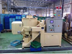本机为带变频调速的新型高效全自动涡流式研磨机。具有外形美观、结构合理、操作方便、调速范围大、翻转灵活、倾倒角度大、运转平稳、噪音低、研磨效率高等特点,能有效地解决振动研磨中工件重叠、研磨不均等问题。特别是对于较轻小的工件,较厚的氧化膜及较大毛刺的工件,在振动机中加工困难而在涡流研磨机中可在很短的时间内达到效果。并可提高表面粗糙度2级以上。研磨效果是振动机的10倍左右。